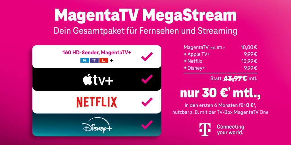 1) Aktion gilt bis 30.06.2025 für MagentaTV Neukunden. MagentaTV MegaStream kostet in den ersten 6 Monaten 0 €/Monat, danach 30 €/Monat. Mindestvertragslaufzeit 24 Monate. MagentaTV ist über die MagentaTV App ohne zusätzliche Hardware empfangbar. Auf Wunsch kann die TV-Box MagentaTV One für 5 €/Monat, zzgl. 6,95 € Versandkosten, mit einer Mindestvertragslaufzeit von 12 Monaten erworben werden. MagentaTV MegaStream enthält RTL+ Premium, Netflix Standard, Disney+ Standard und Apple TV+ (jeweils HD verfügbar). Voraussetzung für die Buchung und Nutzung von Netflix, Disney+ und Apple TV+ sind ein Wohnsitz in Deutschland sowie die Registrierung und Akzeptanz der Nutzungsbedingungen. Es gelten gesonderte Datenschutzbestimmungen bei Netflix International B.V. und Disney+. Bei Nutzung über das Mobilfunk-Datennetz erfolgt die Belastung des Datenvolumens beim jeweiligen Mobilfunk-Anbieter.