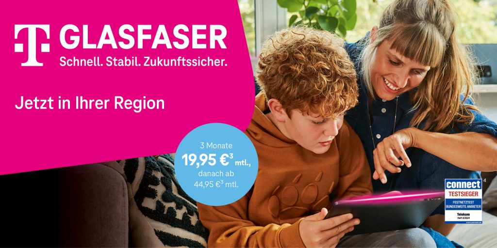 2) Aktion gilt bis 30.06.2025 für Breitband-Neukunden, die in den letzten 3 Monaten keinen Breitbandanschluss bei der Telekom hatten. Glasfaser 300 kostet in den ersten 3 Monaten 19,95 €/Monat, danach 49,95 €/Monat. Bei Miete eines Routers im Endgeräte-Service-Paket (i. H. v. 7,95 €/Monat) erfolgt eine Router-Gutschrift i. H. v. 100 €. Hardware zzgl. 6,95 € Versandkosten. Der einmalige Bereitstellungspreis für einen neuen Telefonanschluss beträgt 69,95 €. Die Mindestvertragslaufzeit für Glasfaser 300 beträgt 24 Monate, für Hardware 12 Monate. Für die Bereitstellung von Glasfaser 300 ist ein Glasfaser-Hausanschluss erforderlich. Sofern noch nicht vorhanden, wird dieser bei einer verbindlichen Buchung des Tarifs Glasfaser 300 neu verlegt, vorausgesetzt, die Anschlussadresse für den Tarif ist mit der Adresse des mit Glasfaser anzuschließenden Gebäudes identisch. Die Bereitstellung erfolgt, wenn Hauseigentümer/Hausverwaltung dem Ausbau zustimmen und die finale Prüfung den Ausbau bestätigt. Durch Eingabe einer Adresse auf der Internetseite telekom.de/glasfaser kann geprüft werden, ob diese in einem Glasfaser-Ausbaugebiet der Deutschen Telekom liegt.