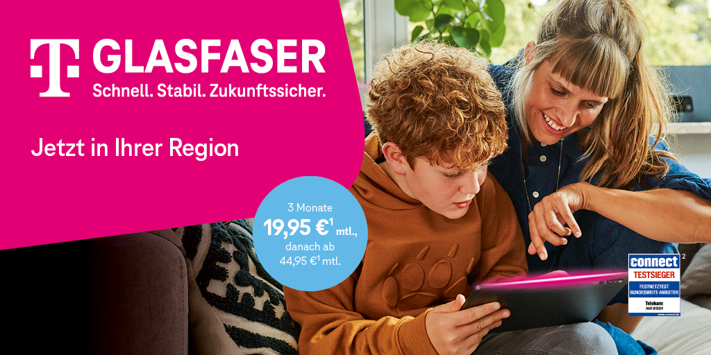 1) Aktion gilt bis 30.06.2025 für Breitband-Neukunden, die in den letzten 3 Monaten keinen Breitbandanschluss bei der Telekom hatten. Als Glasfaser-Tarif gilt z. B. Glasfaser 150. Dieser kostet in den ersten 3 Monaten 19,95 €/Monat, danach 44,95 €/Monat. Einmaliger Bereitstellungspreis für neuen Telefonanschluss 69,95 €. Mindestvertragslaufzeit 24 Monate. Für die Bereitstellung eines Glasfaser-Tarifs ist ein Glasfaser-Hausanschluss erforderlich. Sofern noch nicht vorhanden, wird dieser bei der verbindlichen Buchung eines Glasfaser-Tarifs neu verlegt, vorausgesetzt, die Anschlussadresse für den Tarif ist mit der Adresse des mit Glasfaser anzuschließenden Gebäudes identisch. Die Bereitstellung erfolgt, wenn Hauseigentümer/Hausverwaltung dem Ausbau zustimmen und die finale Prüfung den Ausbau bestätigt. Durch Eingabe einer Adresse auf der Internetseite telekom.de/glasfaser kann geprüft werden, ob diese in einem Glasfaser-Ausbaugebiet liegt.
