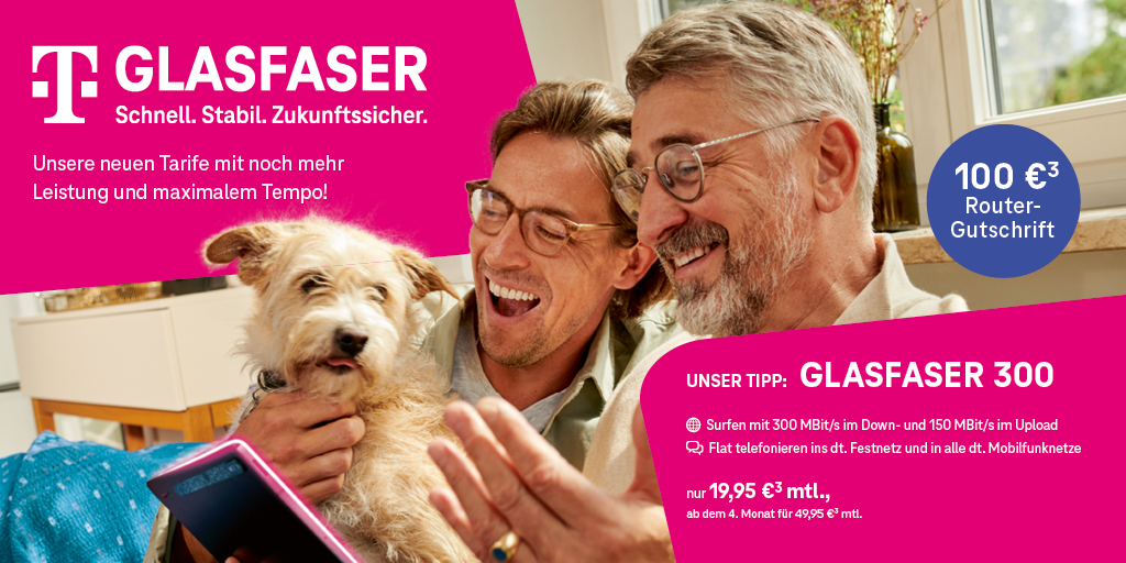3) Aktion gilt bis 30.06.2025 für Breitband-Neukunden, die in den letzten 3 Monaten keinen Breitbandanschluss bei der Telekom hatten. Glasfaser 300 kostet in den ersten 3 Monaten 19,95 €/Monat, danach 49,95 €/Monat. Bei Miete eines Routers im Endgeräte-Service-Paket (i. H. v. 7,95 €/Monat) erfolgt eine Router-Gutschrift i. H. v. 100 €. Hardware zzgl. 6,95 € Versandkosten. Der einmalige Bereitstellungspreis für einen neuen Telefonanschluss beträgt 69,95 €. Die Mindestvertragslaufzeit für Glasfaser 300 beträgt 24 Monate, für Hardware 12 Monate. Für die Bereitstellung von Glasfaser 300 ist ein Glasfaser-Hausanschluss erforderlich. Sofern noch nicht vorhanden, wird dieser bei einer verbindlichen Buchung des Tarifs Glasfaser 300 neu verlegt, vorausgesetzt, die Anschlussadresse für den Tarif ist mit der Adresse des mit Glasfaser anzuschließenden Gebäudes identisch. Die Bereitstellung erfolgt, wenn Hauseigentümer/Hausverwaltung dem Ausbau zustimmen und die finale Prüfung den Ausbau bestätigt. Durch Eingabe einer Adresse auf der Internetseite telekom.de/glasfaser kann geprüft werden, ob diese in einem Glasfaser-Ausbaugebiet der Deutschen Telekom liegt.